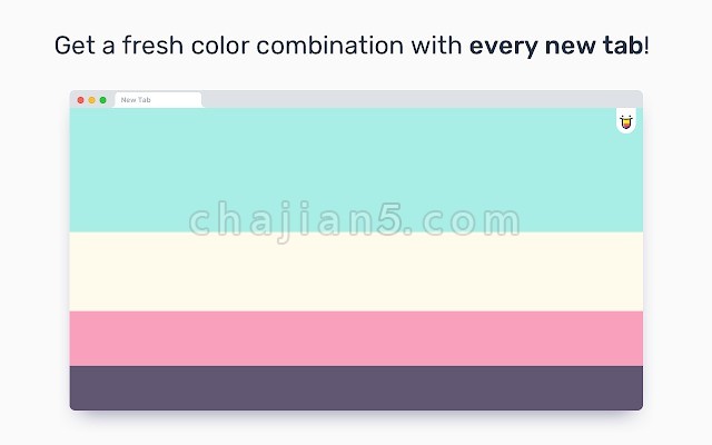 Color Tab fills up your "new tab" screen with a beautiful color palette from the best of Color Hunt's collection. Each time you open up a new tab, the page will be replaced with a random color combination.