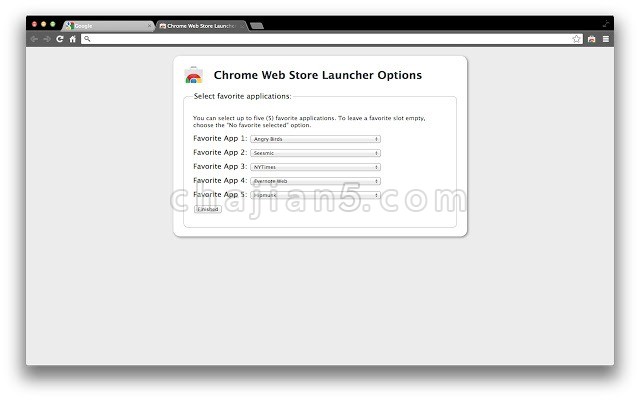 The Chrome Web Store Launcher extension provides a quick and easy way to access your installed applications, define favorite apps, search for new apps, and visit the Chrome Web Store.* Define up to 5 favorite apps for fast access