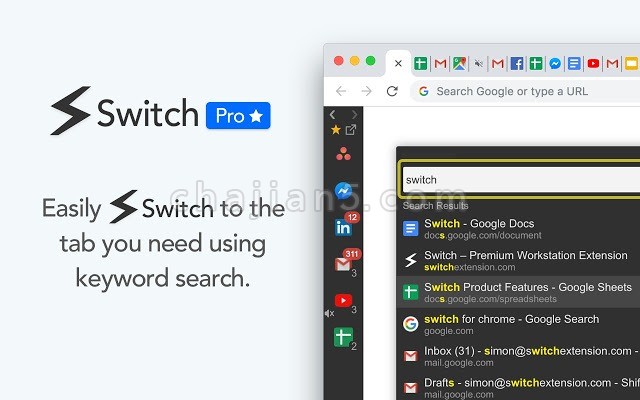Unlike desktop workstations, Switch runs inside your Chrome web browser so you can manage all your web applications without sacrificing flexibility and features.The basic functionalities of the tab manager are free. We also offer a Switch Pro subscription plan that provides advanced functionalities such as: